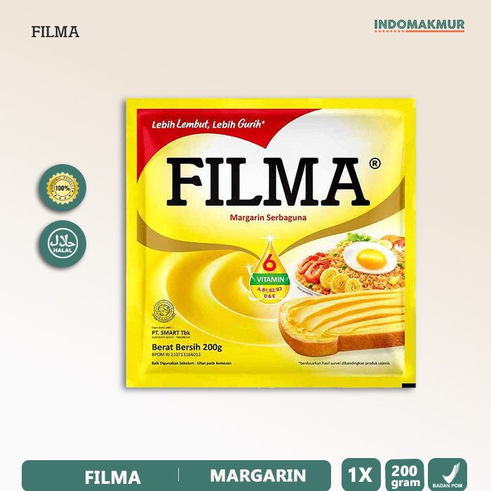 Filma Margarine, Margarine serbaguna yang terbuat dari 100% Real Margarine untuk hasilkan tekstur yang lebih lembut, dan rasa yang lebih gurih! -Mengandung omega 9 6, serta provitamin A -Ideal dijadikan sebagai olesan roti atau untuk memasak dengan rasa gurih yang membuat masakan menjadi nikmat BPOM RI MD 210713166013 Sertifikat Halal : 00080007461297 Berat Bersih : 200gr Note : Harga berlaku per 1pcs Isi : 200gr x 1pcs PERHATIKAN ! Wajib menambahkan extra bubble wrap atau kardus saat membeli produk, supaya paket lebih aman dalam pengiriman. Jika terjadi kerusakan pada saat pengiriman, namun tidak menambahkan extra bubble wrap / kardus, maka admin tidak akan membantu proses klaim ke pihak marketplace / ekspedisi. https://shopee.co.id/product/81557228/29623549596